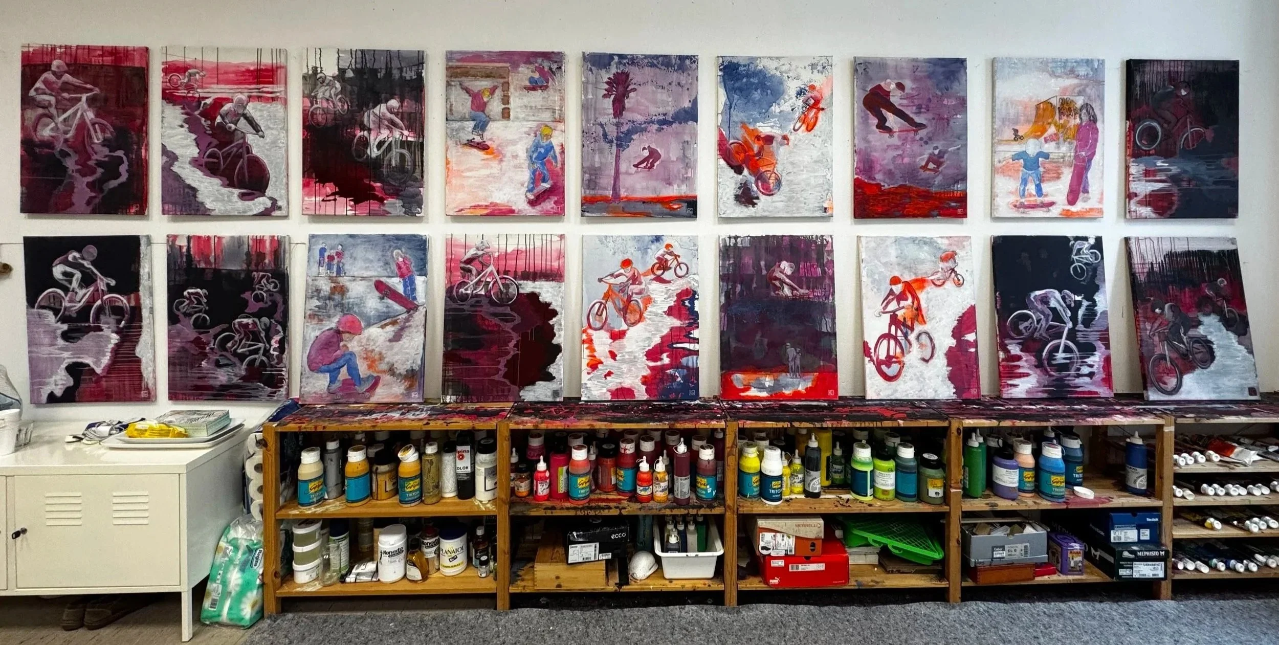 "Freedom in motion", 8 times 70x50cm, 140x200cm, individually framed, hung as a block. ..........An observation in the bike and skate park Bielefeld Kesselbrink, Germany..........I admire the courage and skill of the bikers and see between the lines, symbolically our paths through life with all the paths, obstacles, tightrope walks, decisions and the learning process to be mastered. Always getting up again, starting again and driving on. Courage and sometimes imposition, Acrylic on canvas, until 2022........................................ "Freiheit in Bewegung", "Freedom in motion", 8 mal 70x50cm, 140x200cm, einzeln gerahmt, als Block gehängt..........Eine Beobachtung im Bike- und Skaterpark Bielefeld Kesselbrink, Deutschland..........Ich bewundere den Mut und das Können der Biker und sehe zwischen den Zeilen, sinnbildlich auch unsere Lebenswege mit all den zu meisternden Wegen, Hindernissen, Gratwanderungen, Entscheidungen und den Lernprozess. Ein immer wieder neu aufstehen, wieder starten und weiterfahren. Mut und manchmal auch Zumutung.....Acryl auf Leinwand, bis 2022